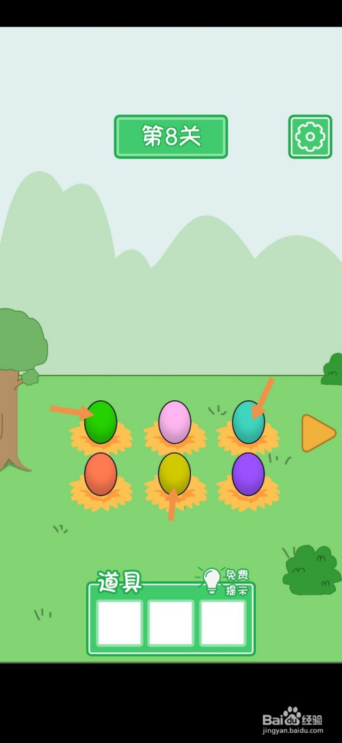第8关先点击绿蛋、黄蛋、蓝蛋,接着点击标的目的右箭头到右边去。