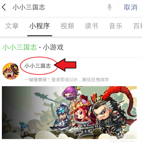 手机打开微信,搜刮输入【小小三国志】,再点击该小程序。