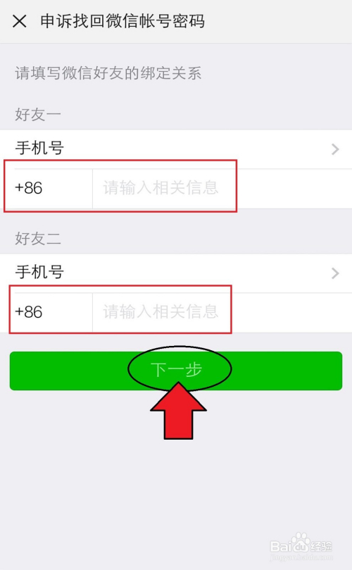 填写绑定的微信老友的手机号,需要填写两个老友手机号,再点击【下一步】
