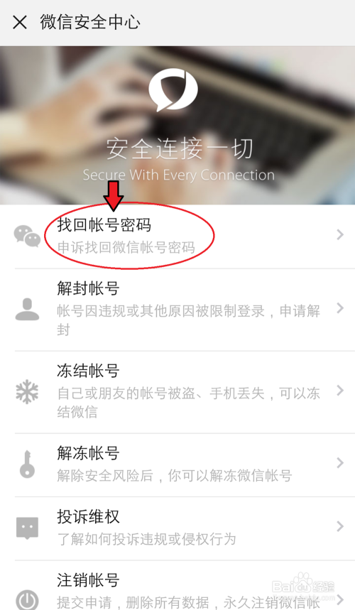 进入微信平安中间,点击【找回账号密码】