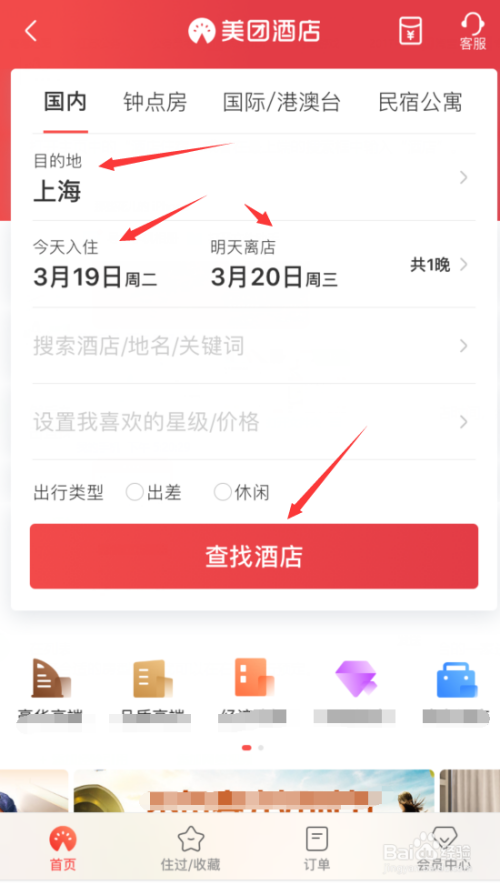 然后在页面中输入本身的目标地,国内仍是国外,入住时候和离店时候,然后点击查找酒店。