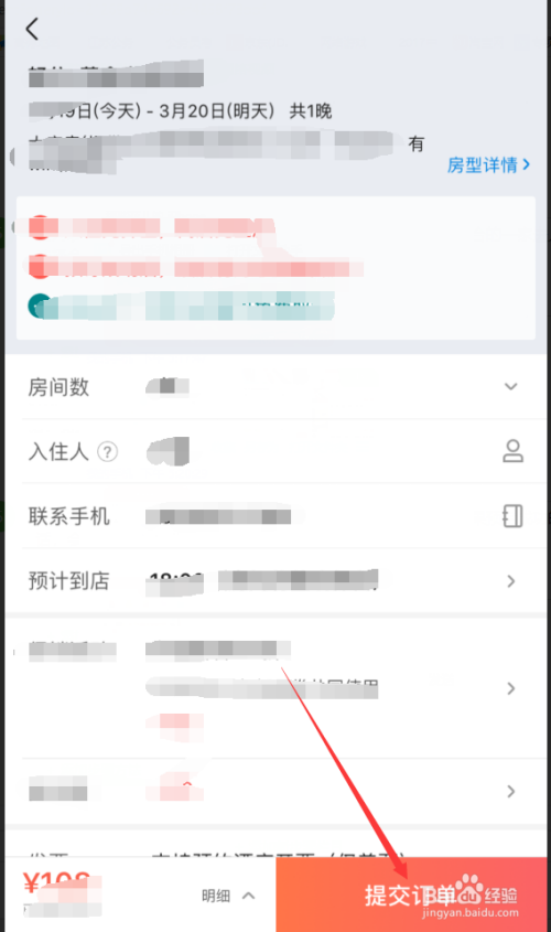 然后在结算页面,细心查对住宿信息之后就可以提交信息了,若是预定酒店当作功的话,会给你发送一条预定酒店的信息,也可以在订单中查到到。