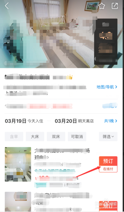 在列表中会显示出本身所需要的目标地四周的酒店,我们选择适合的一家进入,选择合适的房型之后就可以在右侧点击预定酒店。