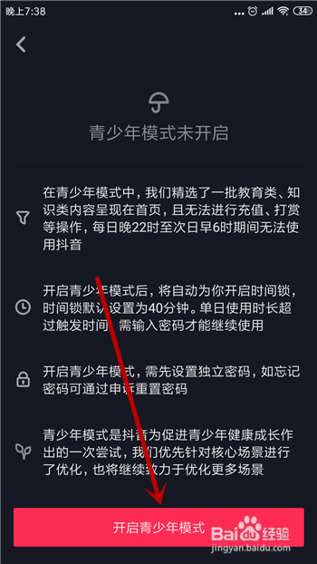 可以看到这个模式的感化是保举一些教育相关的视频,并且不克不及进行打赏等行为,点击【开启青少年模式】。