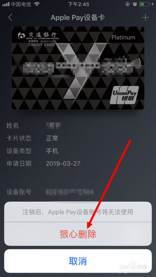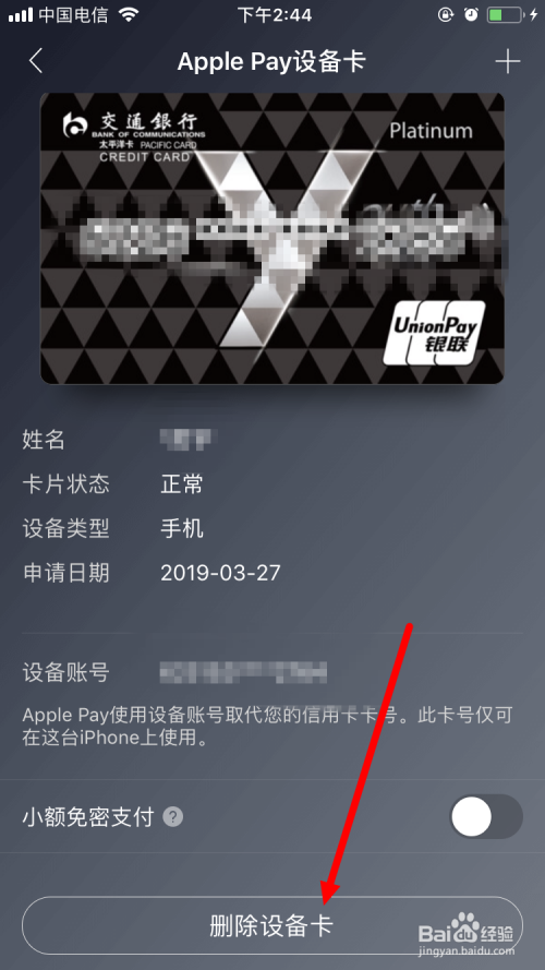 然后会进入 Apple Pay设备卡 的页面,在页面中会显示我们已经绑定的交通银行信用卡。点击最下端的 删除设备卡 。
