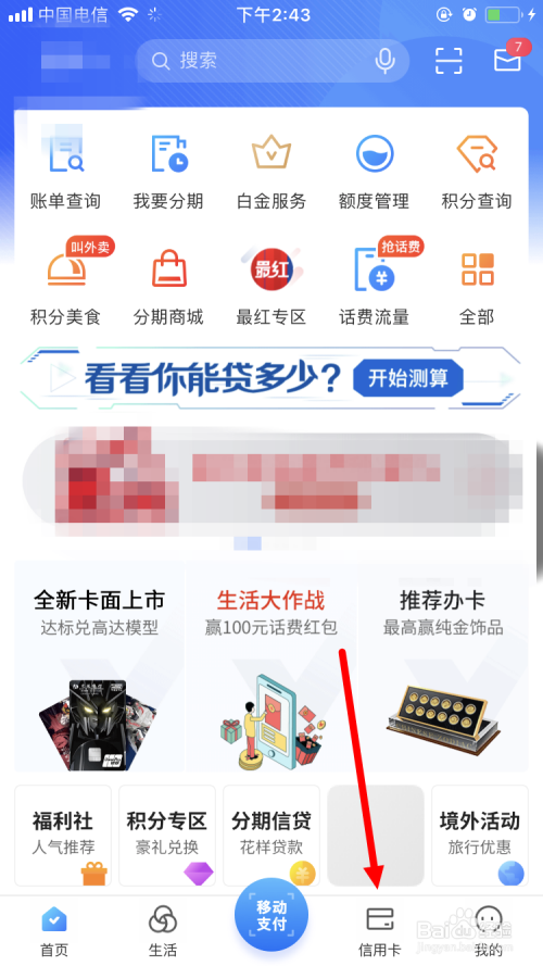 首先在手机上打开并登岸买单吧App,并在首页面点击 信用卡 。