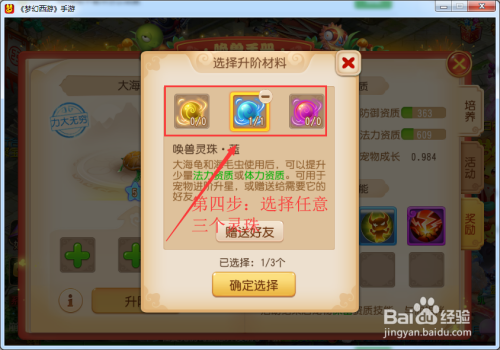 打开大海龟培育材料添加界面今后,在界面中选择肆意三种灵珠。完当作选择今后点击“确定选择”。