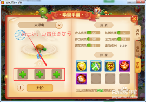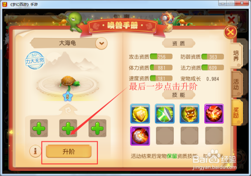 完当作材料的添加今后,游戏玩家最后点击界面上的“升阶”选项。这样就可以对大海龟进行培育了。可是玩家需要注重,升阶培育当作功是有概率的。不是百分之百培育当作功的。