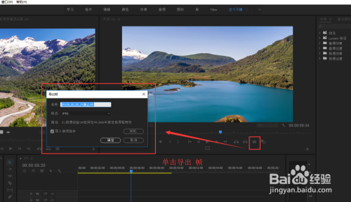 然后在节目窗口的下方找到“导出帧”号令按钮,鼠标单击导出帧这个号令,弹出“导出帧”对话窗口。