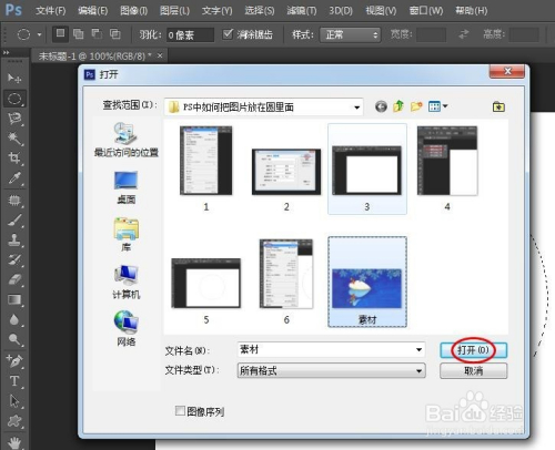 第三步:单击菜单栏“文件”中的“打开”,选摘要放到圆中的图片。