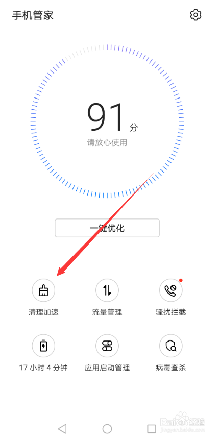 进入华为mate20 pro手机管家界面后直接点击下面的【清理加快】,如下图所示。