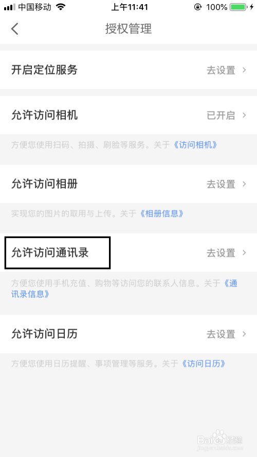 打开授权办理页面选项中选择点击“许可拜候通信录”。