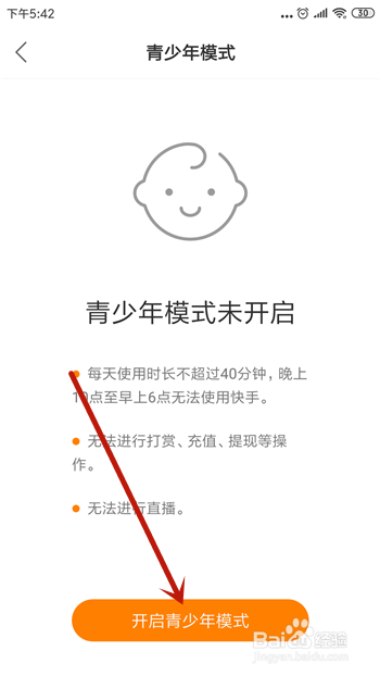 进入开启界面后先领会下青少年模式是什么,其实就是不克不及直播、不克不及搭上和一些不雅看时候受限制,这也是为了庇护青少年,点击【开启青少年模式】。