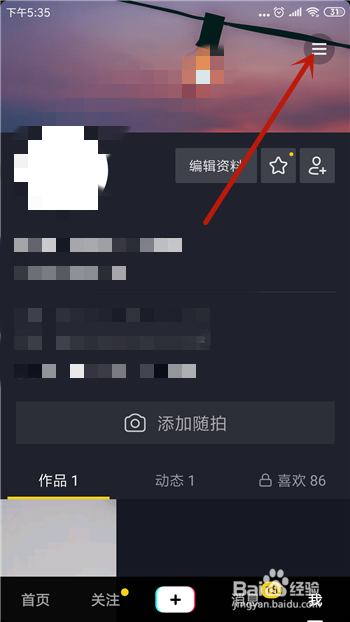 接着在抖音的小我本家儿页里点击右上角的【三】。