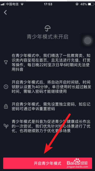 我们点击进入后,可以看到青少年模式的介绍及限制的功能,我们点击下方的开启。