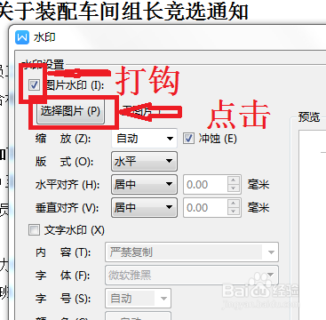 进入水印设置对话框,在第一项前面打钩,是其变为深黑色,旁边的选择图片按钮可一点击,点击选择图片。