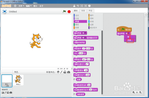 声音后面就显示出我们适才添加的音乐,点击绿旗执行程序,就起头播放我们添加好的布景音乐了。