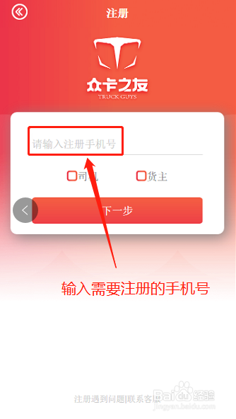 2.在中心输入想要注册的手机号,选择司机/货本家儿的身份,点击“下一步”。