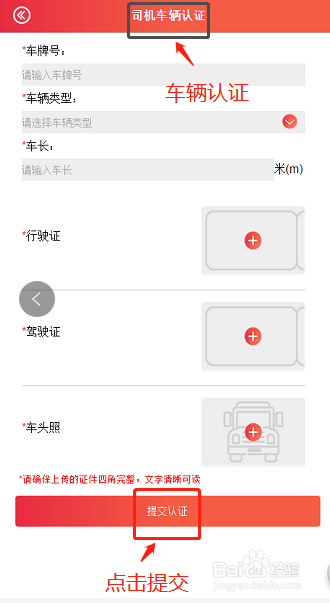 b:车辆认证:“车商标”“车辆类型”“车长”“行驶证”“驾驶证”“车头照”,信息填写完毕,点击“提交认证”。