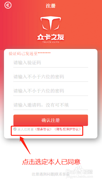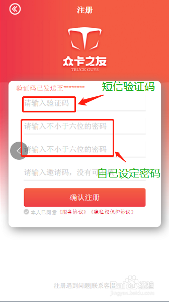 3.点击下一步直接调出界面,输入注册手机接收到的验证码,输入本身要设定的密码,点击最下方“本人已赞成《办事和谈》和《隐私权庇护和谈》”,设定完当作后,点击“确认注册”
