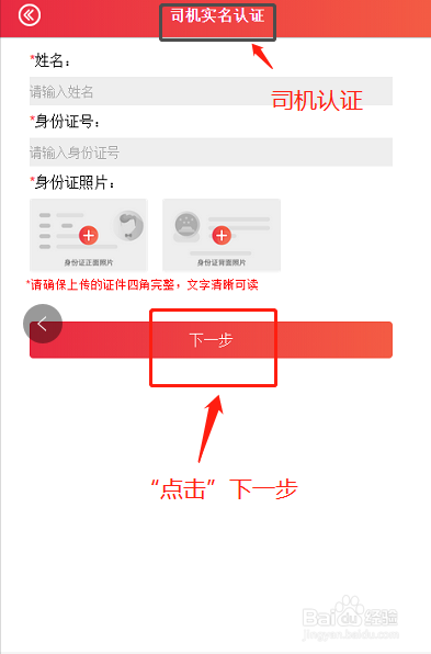 7. a:司机认证:输入“姓名”“身份证号”“身份证照片”,填写完毕,点击“下一步”