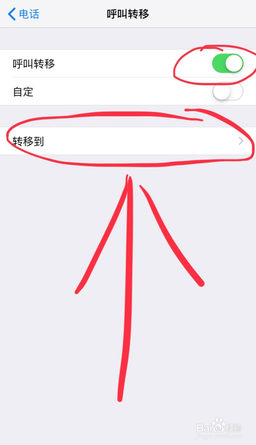 呼叫转移右边点击开启,然后点击下边的【转移到】。