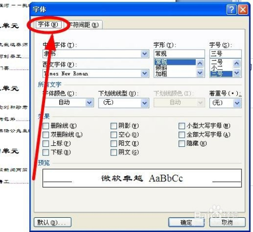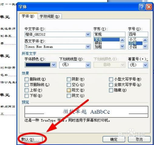 我们在“字体”选项下面可以看到默认的“中文字体”是“隶书”,要点窜当作“楷体-GB2312”。单击“中文字体”输入框后面的小箭头