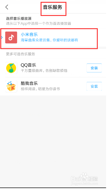 这时,你就会看到音乐办事的页面,选择你喜好的音乐播放源,如图所示