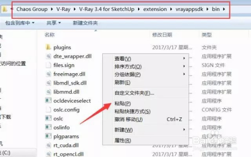 17.将“vray.dll”文件复制到:“C:\Program Files\Chaos Group\V-Ray\V-Ray 3.4 for SketchUp\extension\vrayappsdk\bin”文件夹中。在空白处鼠标右击选择粘贴,然后再选择复制和替代即可。
