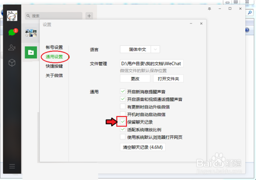 呈现对话框,点击【通用设置】,再给【保留聊天记实】打“ √ ”。