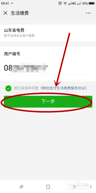 在“糊口缴费”页面输入用户编号而且勾选“办事和谈”