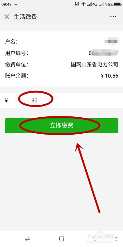 在弹出页面显示出用户名称、编号、缴费单元、用户余额等信息,查抄无误,输入缴费金额后,单击“当即缴费”