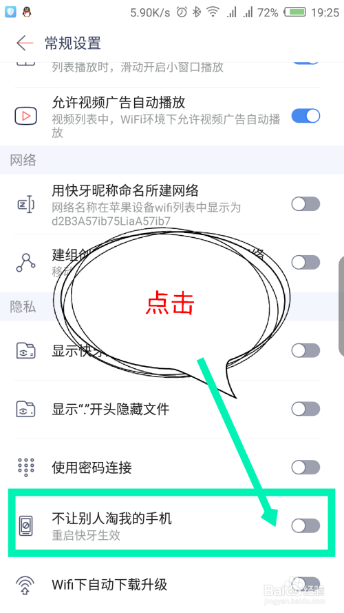 在最后打开的常规设置界面,滑动屏幕到最下面,有个不让别人淘我的手机选项,点击后面的滑块。如图所示