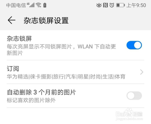 若是已经启用【杂志锁屏】功能,那么在【杂志锁屏】功能的下面有【订阅】和【主动删除3个月前的图片】功能。点击启动【订阅】功能。进入【订阅】功能页面。