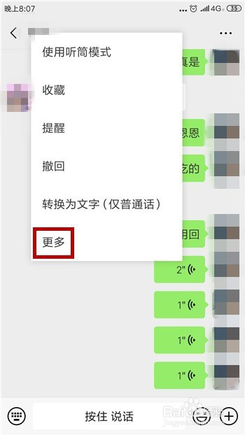 我们打开微信聊天界面,长按语音,在呈现的成果中点击【更多】。