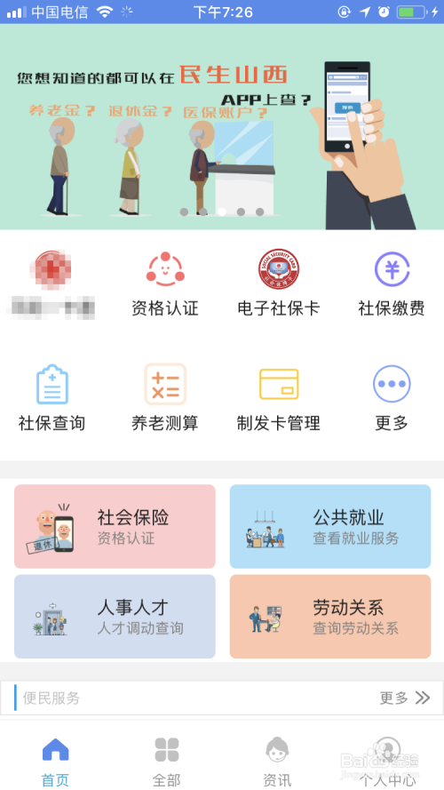 这样我们就进入了 平易近生山西App 的本家儿界面。下面就可以进行注册账号,以及相关操作了。