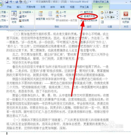 页面主动弹出“设计”选项卡,找到“选项”功能区,选择“奇偶页分歧”单击,勾选该功能