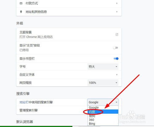 鄙人拉菜单中选择本身习惯利用的搜刮引擎,好比百度单击
