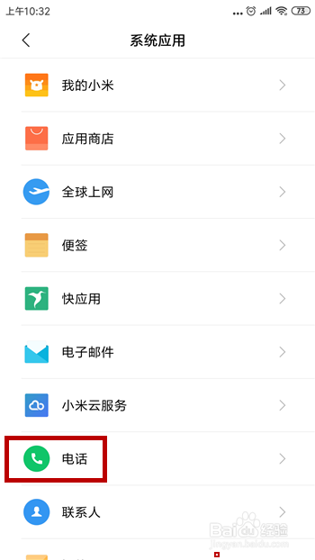 然后在系统应用中找到此中的【德律风】并点击打开德律风设置。