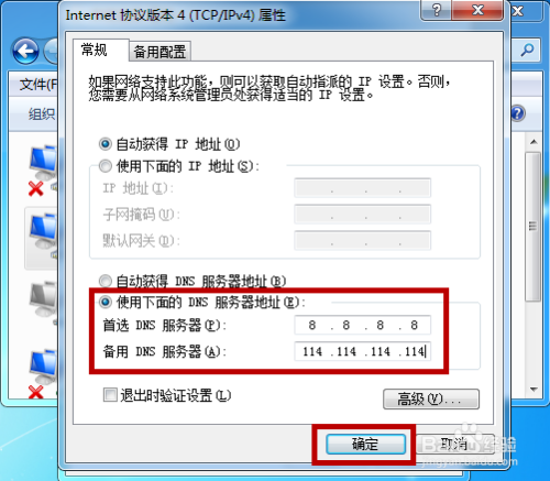 DNS获取体例选择为手动输入,然后首选DNS办事器设置为【8.8.8.8】,备用设置为【114.114.114.114】,设置好后点击【确定】。