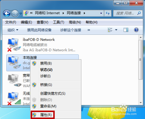 鼠标右击当地毗连,点击【属性】(若是是无线网也是一样操作)。