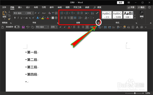 接着在“起头”菜单的下拉选项中找到“段落”选项组,在该选项组的右下角找到并点击扩展功能折叠按钮。