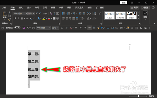 封闭后,我们点击“段落”弹窗下方的“确定”按钮封闭弹窗,返回到word中就可以发现选中的每一个段落前面的小黑点都消逝了。