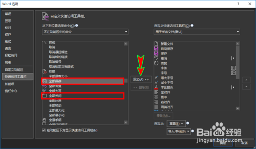 然后鄙人方的号令中找到并选择“全数保留”和“全数封闭”两个号令,选好后将其添加到快速拜候东西栏中。
