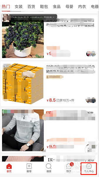 登录本身的拼多多账号,进入账户首页。在首页右下角找到【小我中间】图标,如图所示,点击该图标进入小我中间本家儿页!
