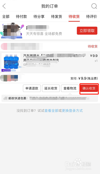 点进去后,在我的订单本家儿页下找出需要收货的订单,点击该订单右下角红色的【确认收货】按钮,如图所示!