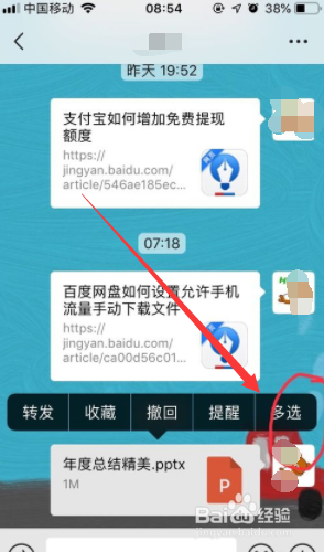 打开微信,找到要发送的文件聊天记实,长按聊天记实,会呈现一排操作提醒,点击“多选”