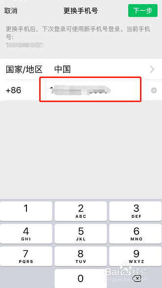 在改换手机号本家儿页下的白框中输入想要改换为的手机号,然后点击页面右上角的【下一步】,如图所示!