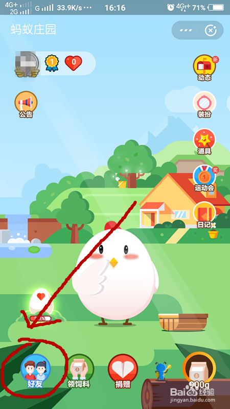 我们进入蚂蚁庄园今后,可以看到我们的小鸡,我们点击左下角的老友,寻找喂食的老友。