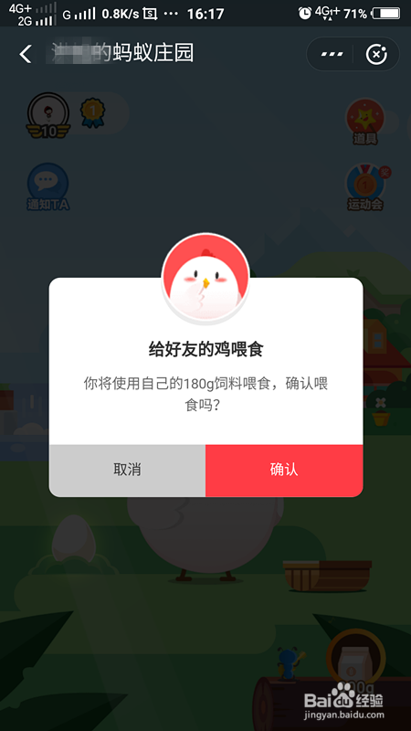 这时辰系统会有一个确认,因为是拿你本身的食物喂老友的小鸡,如下图所示。